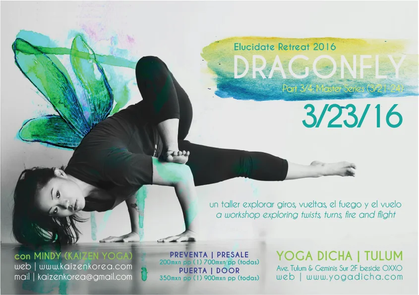 El movimiento dinámico de la libélula se ha inspirado este taller. Como su inspiración de la naturaleza, la asana de la libélula necesita equilibro, energía y varios partes de sinergia en fusión para crear movimiento.
